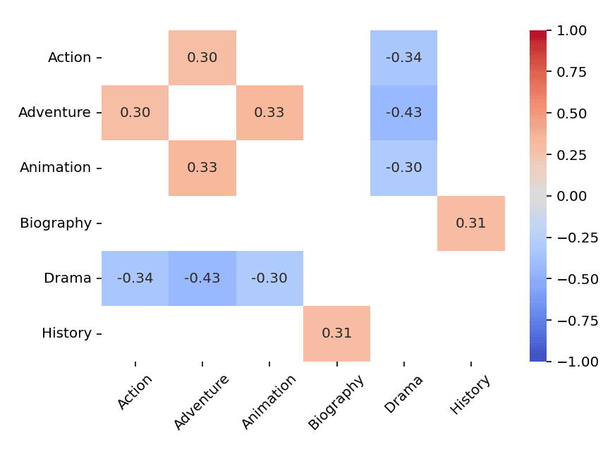 The first value, 0.61, is the correlation coefficient of the IMDB Rating column and the No of Votes column. Seeing as this value is higher than 0.30, it tells us there is a moderate positive correlation between the number of votes and the IMDb ratings. This suggests that movies with larger number of votes tend to have relatively higher IMDb ratings.