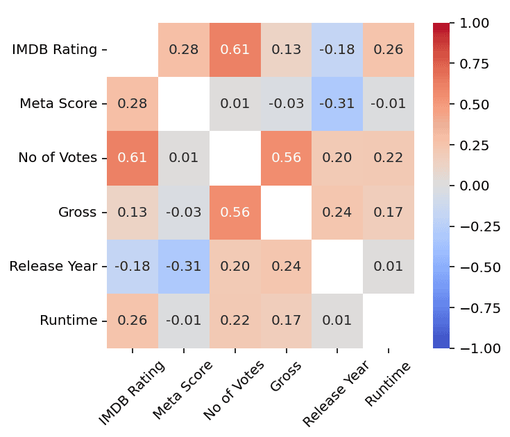 • Although the average revenue, release year, and number of votes per movie are all lower in the Metascore top 10, aside from the Gross - No of Votes column pairing, the correlation coefficients between these columns aren't substantial: