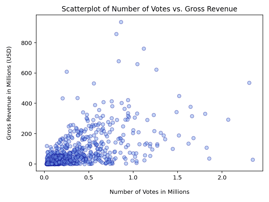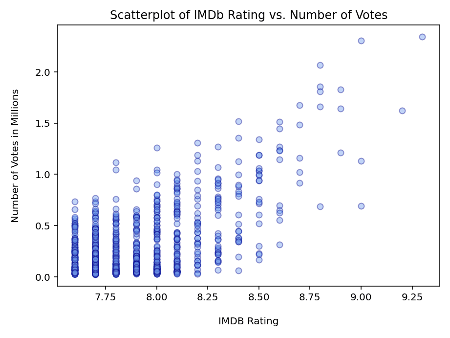 • Looking at how the dots are distributed on the plot, we can see the dots fan out from the bottom left corner towards the top right corner. This, paired with a correlation coefficient of 0.61, suggests that movies with higher IMDb ratings tend to have more votes.