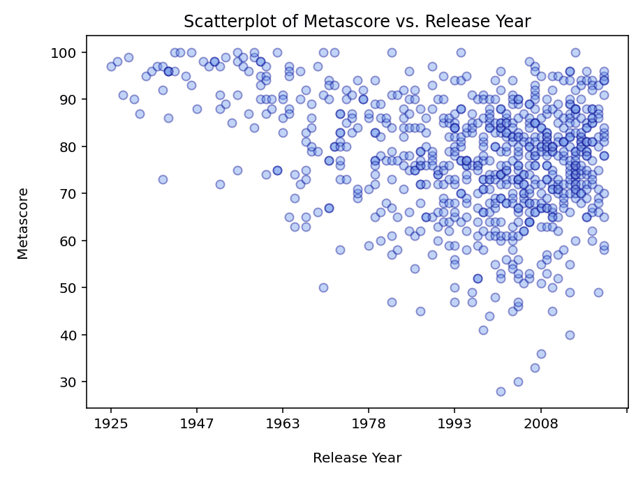 To clear up the confusion a bit more, we can categorize Metascores according to the scorecard shown on their help center page. This lets us create the table above. Based on their respective Metascores, each movie falls into a certain category, shown in the column Metascore Breakdown. For example, the movie The Dark Knight has a Metascore of 84, which puts it in the category 81-100 points. As we can see in the Metascore Meaning column, it means that the movie has earned Universal Acclaim. This categorization gives us the following insights:
