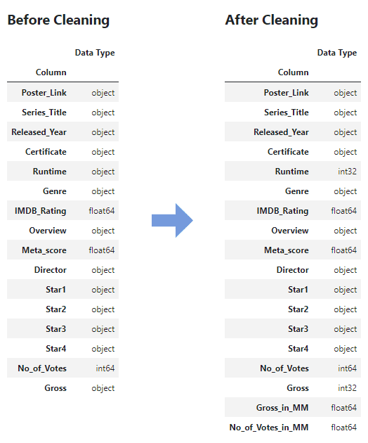 The quality of your insights is generally only as good as the quality of your data. It comes as no surprise that data cleaning is an essential step in an EDA. Here, we will explore the data cleaning process the top 1000 IMDb movies dataset has undergone. Despite the dataset’s relatively good initial condition, there were still adjustments necessary to ensure its integrity and usability. Below, you will see the schema of the dataset before the cleaning process on the left side and the schema after the cleaning on the right side. You will also see a short summary of the most important steps taken in the data cleaning process, which laid the foundation for the insights in the rest of this exploratory data analysis.