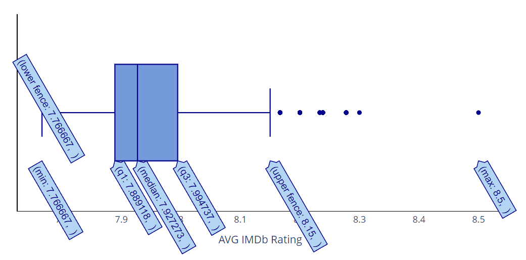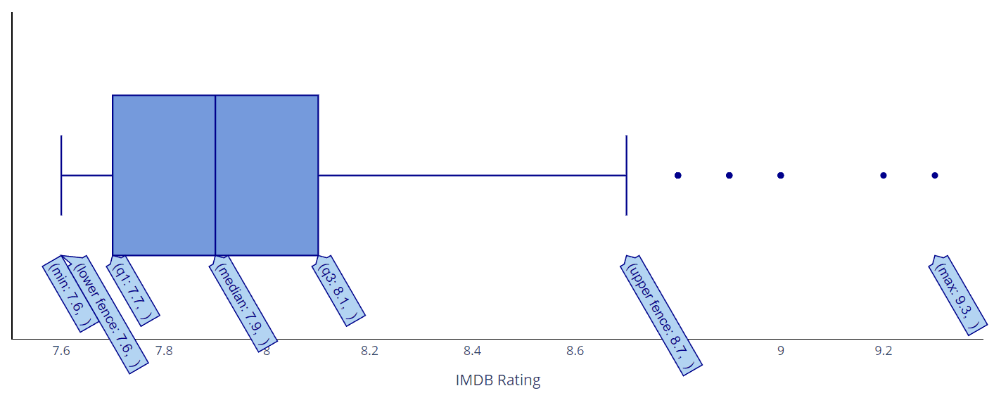 In our boxplot, the median is 7.9. This means that half of the IMDb ratings is equal to or below it (everything to the left of the median), and half of it is equal to it or above it (everything to the right of the median).