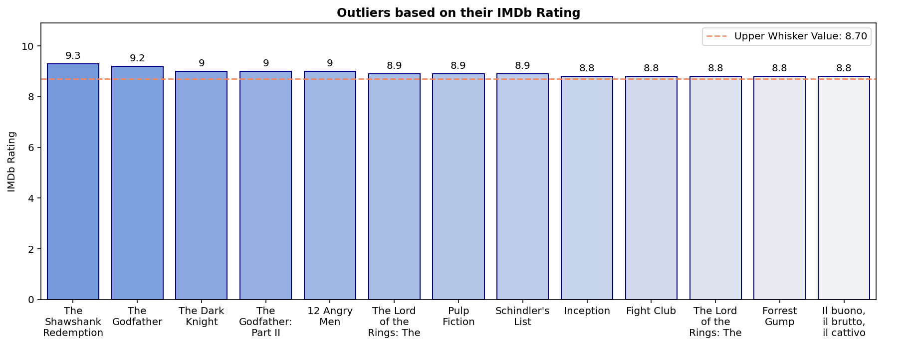 All of the movies on the bar chart above are outliers based on their respective IMDb ratings. On the boxplot we saw earlier, two whiskers were visible, depicting the range of the data. Everything exceeding this range was considered an outlier. Looking at the bar chart above, we also see a horizontal dashed line. This line represents the right whisker, so it lets us see by what margin the movies above have exceeded the range.