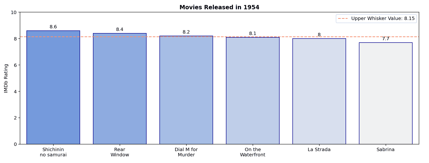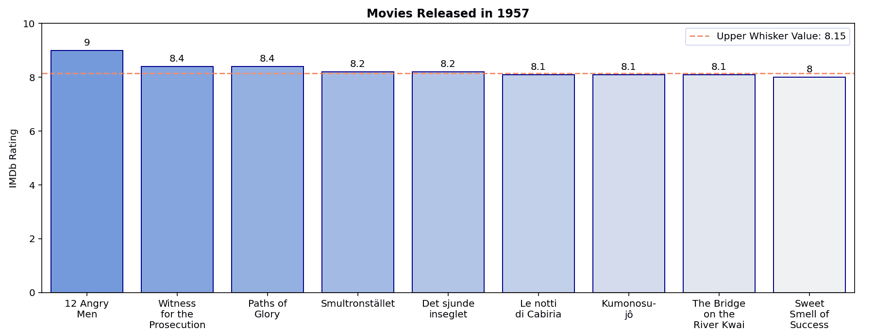 The bar chart above shows us all of the movies released in the year 1957, along with their respective IMDb ratings. The bar chart is sorted by IMDb rating, from the highest on the left to the lowest on the right. Similarly to the 1954 bar chart we saw earlier, we have a dashed, horizontal line denoting the value of the upper whisker (8.15), marking the threshold of a value being an outlier.