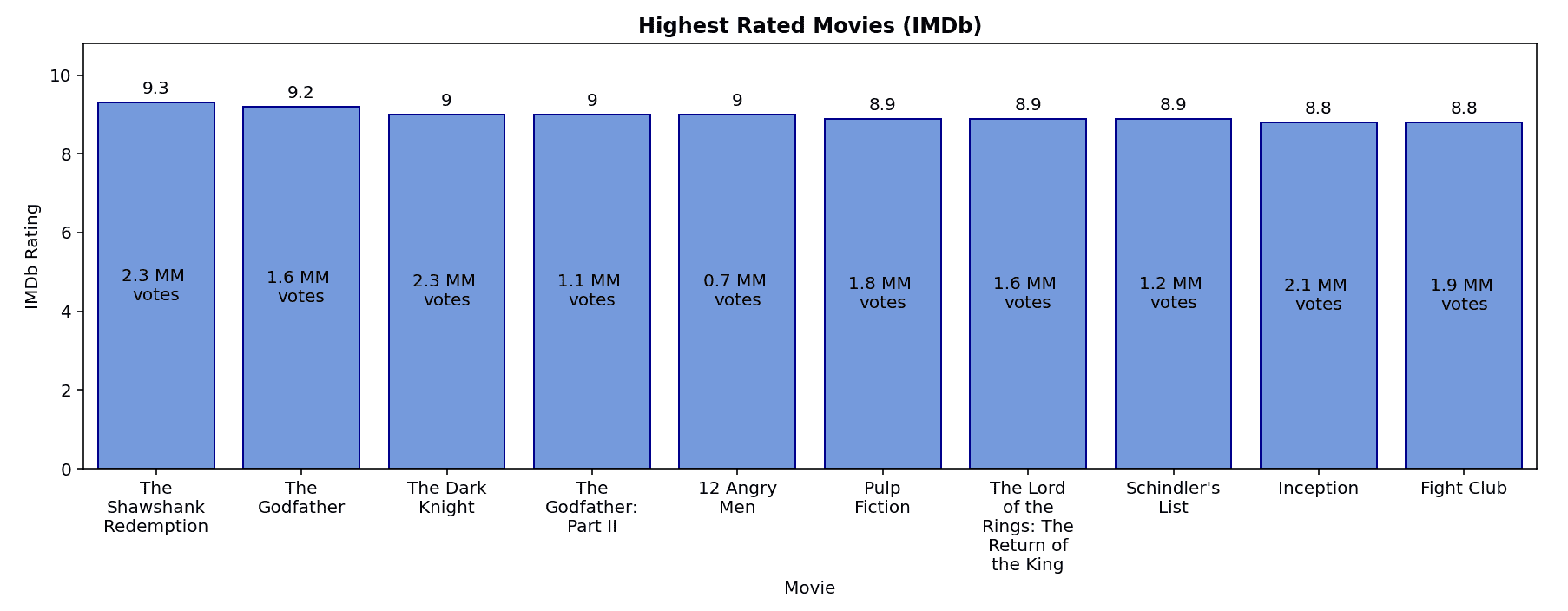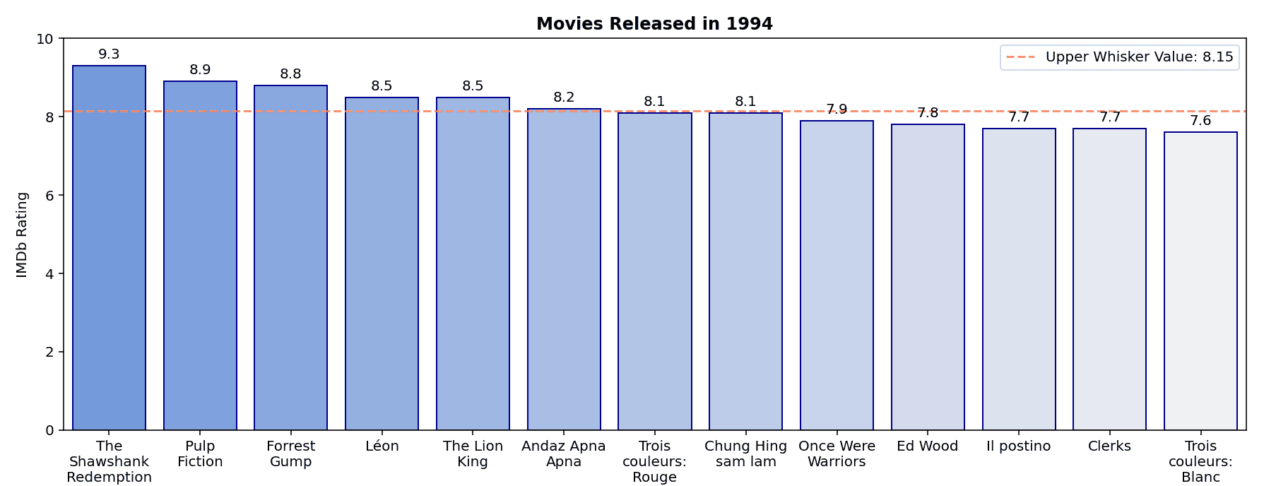 • Looking at the bar chart, we can see that especially the first three movies, The Shawshank Redemption (the number 1 ranking movie in the entire dataset), Pulp Fiction and Forrest Gump, with respective IMDb ratings of 9.3, 8.9 and 8.8, pull the total average IMDb rating for 1994 up to 8.24, making it a relatively strong outlier.
