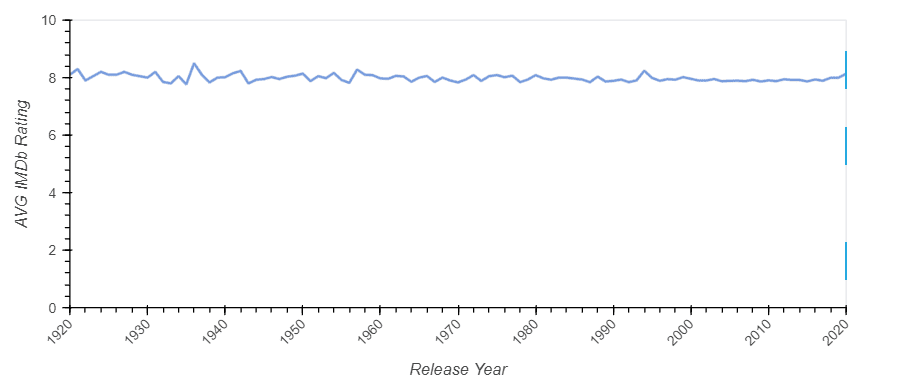 • Out of all the outliers, the year 1936 has the highest average IMDb rating: an 8.5. This is especially visible on the boxplot, as it is the dot all the way to the right. Although this average seems exceptionally high, when we look at the Movie Count column in the table, we see that this can be explained by the fact that only 1 movie released in 1936 has made it into the dataset.