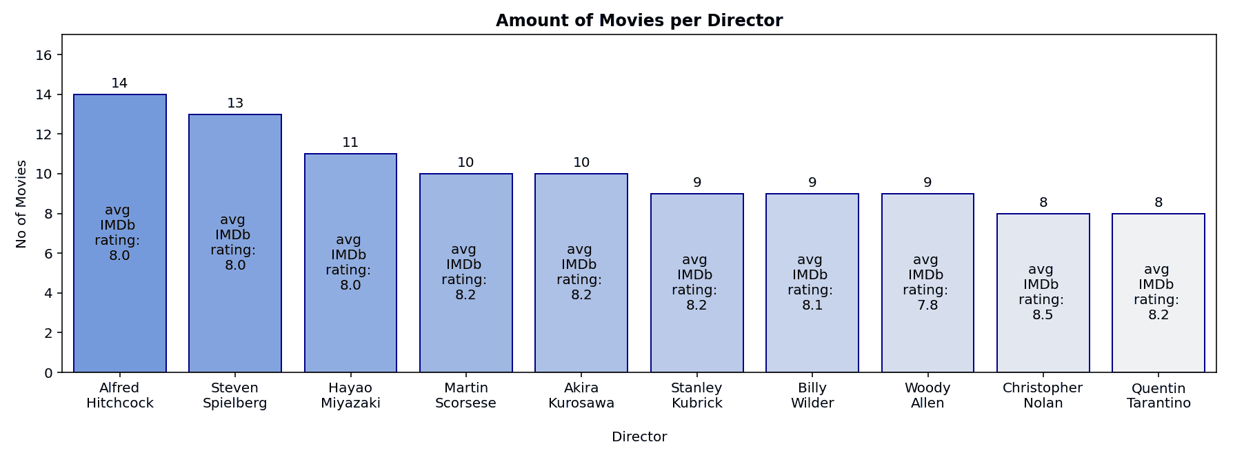 • The top spot is taken by Alfred Hitchcock with 14 movies in this dataset, with an average IMDb rating of 8.0.