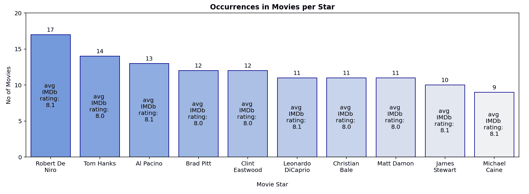 • As can be seen on the chart, the movie star with the most occurrences in our list is Robert De Niro, with 17 movie occurrences with an average IMDb rating of 8.1.